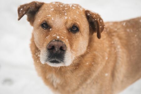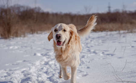 Portrait of happy healthy dog outside in winter season. Cute golden retriever