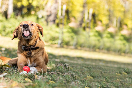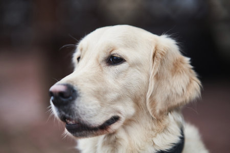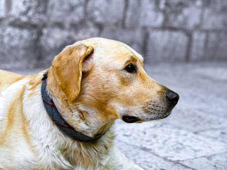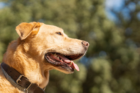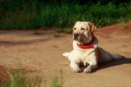 Animal Portrait. Labrador retriever dog looking away, having walk on sunny summer day, copy space, blurred background