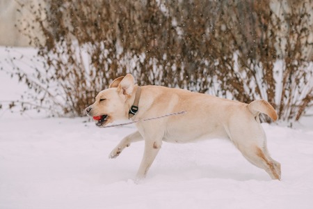Labrador Dog Play Run Outdoor In Snow, Winter Season