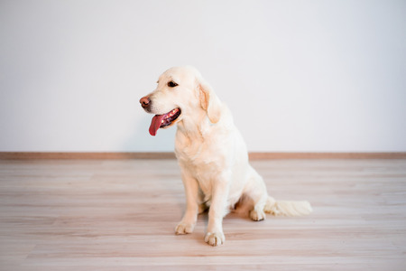 Beautiful labrador retriever dog in the living room. Intelligent and faithful pet