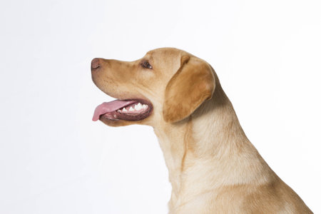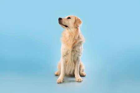Golden Retriever sitting on white background with copy space. Studio shot.