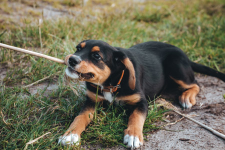 Game with pet chewing a stick outdoor. Playful puppy in collar. Dog training. Young animal scratches its growing teeth with biting a branch. Hunting breed with black and brown fur