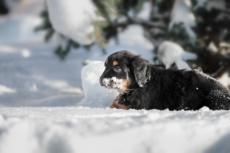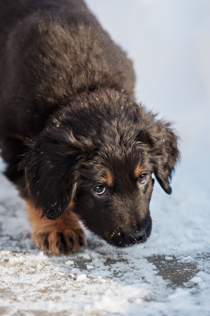 Black and golden hovawart puppy on the snow