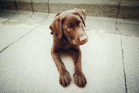Chocolate young labrador dog lying. Image toned.