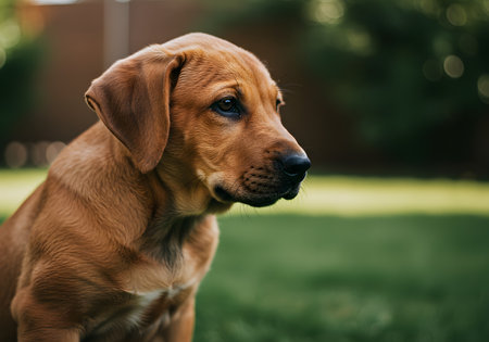 Adorable Rhodesian Ridgeback puppy sitting in the garden. Selective focus.