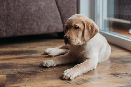 Charming puppy of a beige labrador retriever lies at home on the floor next to the armchair. People and animals. Keeping dogs and caring for them at home