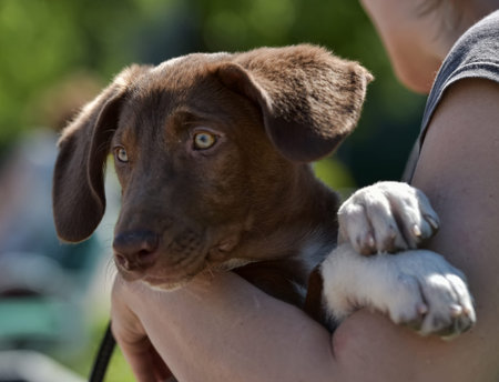 a brown puppy with white paws, who is being held in hands. The puppy looks attentively to the side, his large ears and expressive eyes give the image a special touchingness and curiosity. White paws lie on the person's hand, which emphasizes trust and a sense of care. The photo was taken outdoors on a sunny day, the background is blurred, which focuses attention on the animal. This is a warm and emotional photo that conveys the connection between a person and a dog. Suitable for the theme of pets, pet care, veterinary medicine, animal shelters and advertising of products for dogs.