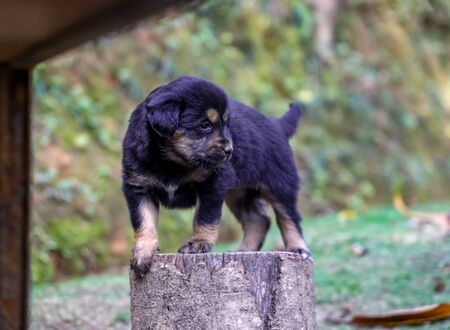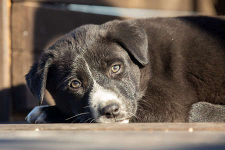 Black cute puppy looking upwards