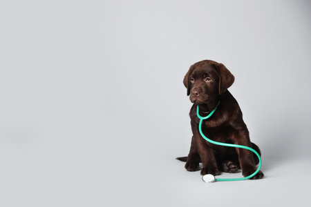 Cute Labrador dog with stethoscope as veterinarian on light gray background. Space for text
