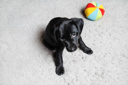 Black puppy sitting on light gray carpet. Little dog with colored ball. Selective focus.