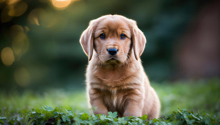 Adorable golden retriever puppy sitting on the grass in the garden