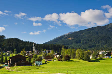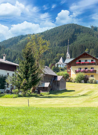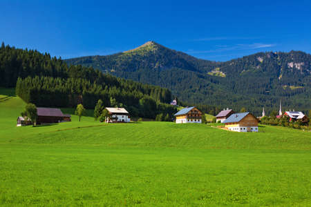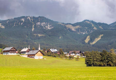 Natural rural landscape with traditional wooden houses in the valley of Enns River at the foot of Rossbrand mountain, part of the Salzburg Slate Alps, Austria