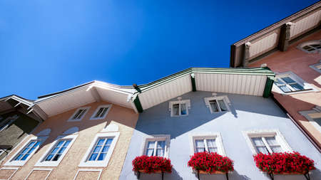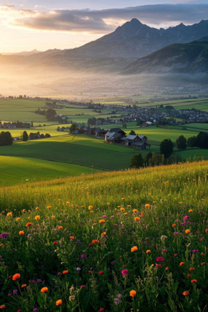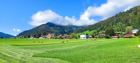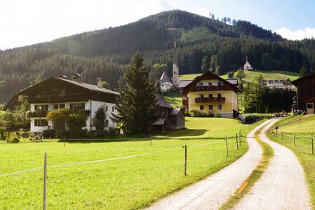 Early morning in Austria. Traditional Austrian landscape: mountains, cozy houses and green lawns. Euro trip. Feeling of calm and stability.