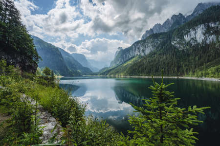 Dachstein Mountains reflected in Gosau beautiful lake, Austria
