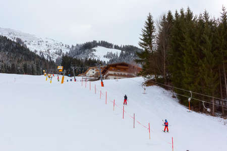 Hinterglemm, Austria - March 4, 2020: Drag lift and ski slope of austrain winter resort and mountains panorama