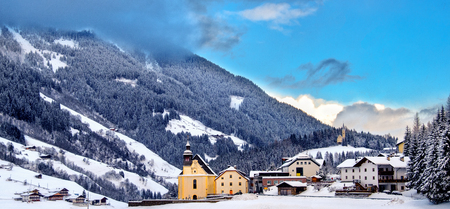 panoramic overview church snowy valley beautiful winter sunny day Trentino Alto Adige Italy