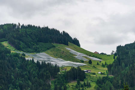 Solar park, photovoltaic power station located on a mountain slope in the Alps. Foggy day, green pasture grass and blue skies and mountains create a fresh and ecological image.