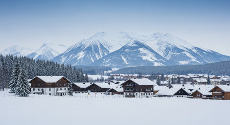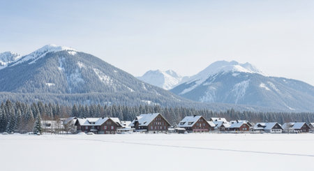 Snowy Village Surrounded by Mountains on a Bright Winter Day