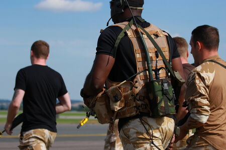 RAF Waddington, Lincolnshire, UK - July 7, 2014: Two Royal Air Force Pilots walking across the tarmac at RAF Waddington with aircraft sitting in the background.
