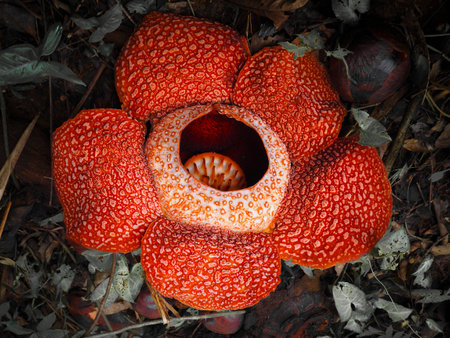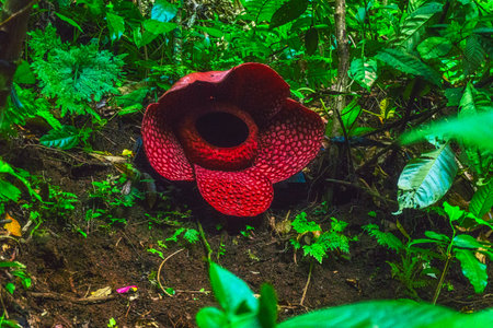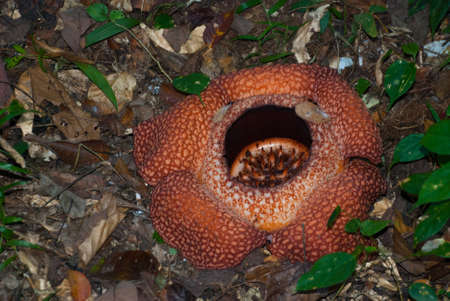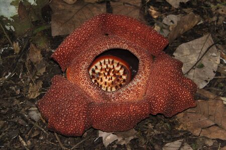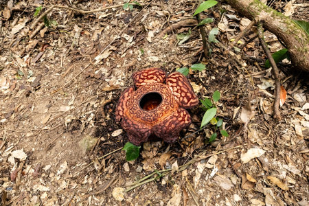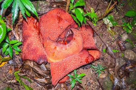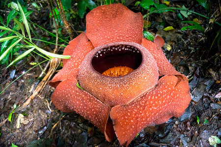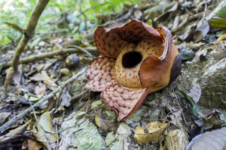 Close up of rafflesia arnoldii, the largest individual flower on earth, blooming on the rainforest floor