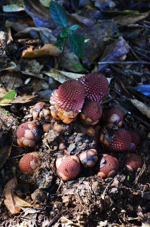 Exotic Flower Pods Displaying Yellow Fruit Seeds on Forest Floor