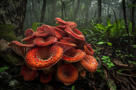 Cluster of bright red mushrooms growing on the forest floor, thriving in the foggy, humid environment