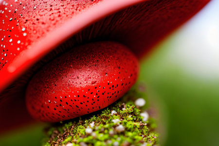 This vibrant red cap mushroom with white spots is a poisonous beauty that can induce psychedelic effects. Captured in macro photography, it's a mesmerizing and captivating sight to behold. . Generative AI.