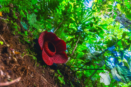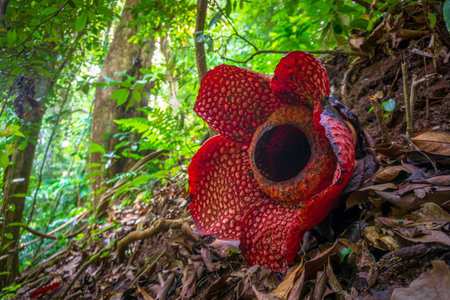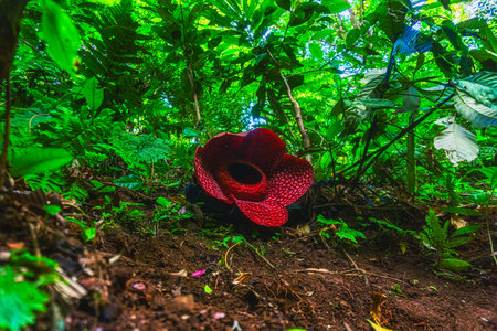 Indonesian morning view in a tropical forest with beautiful Bengkulu rafflesia flowers blooming