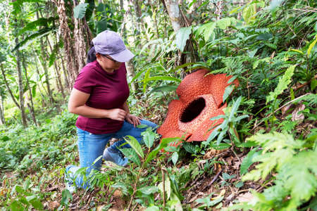 Woman looking at big Rafflesia keithii flower in the jungle of Borneo