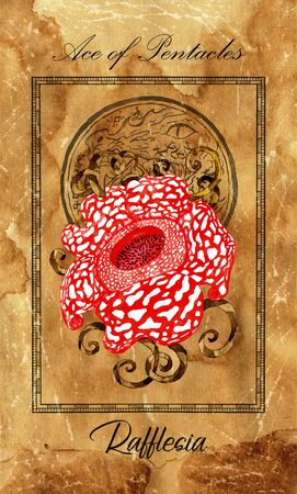Ace of pentacles. Minor Arcana tarot card with Rafflesia and magic seal. Vintage deck Enchanted Flowers. Hand drawn illustration with botanical symbols. Gothic, occult and esoteric background