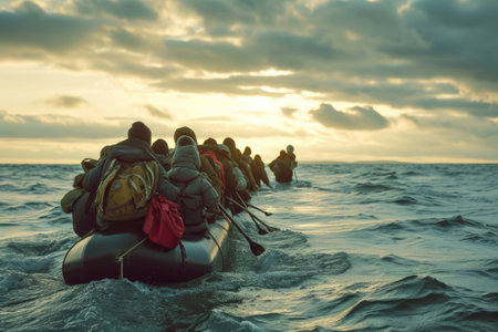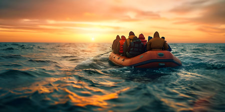 Refugees on a boat due to climate change illustrating the impact on migration crisis. Concept Climate Change, Refugees, Migration Crisis, Environmental Impact, Global Crisis