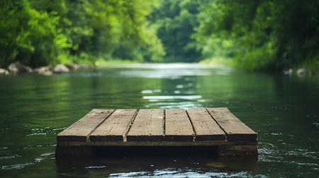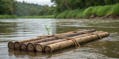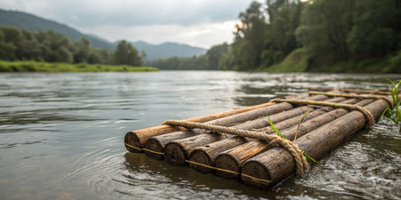 A wooden raft constructed from logs drifts gently along a calm river. Lush green foliage lines the banks, while overcast skies illuminate the serene landscape. Nature thrives in this tranquil setting.