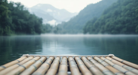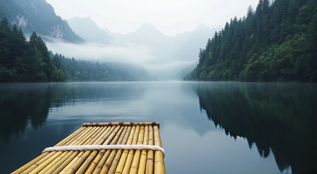 A bamboo raft rests on the still waters of a lake, embraced by misty mountains. The serene atmosphere is highlighted by the soft morning light and distant hills.