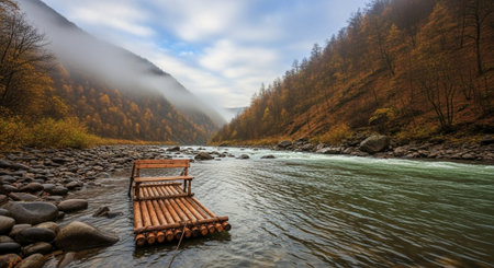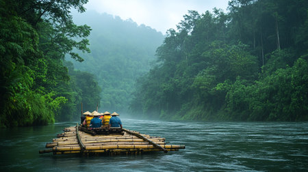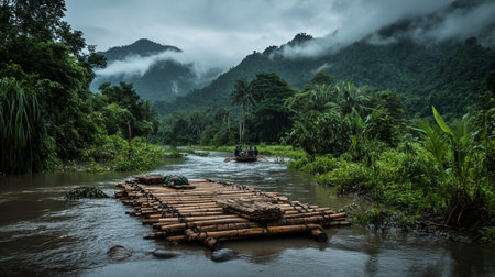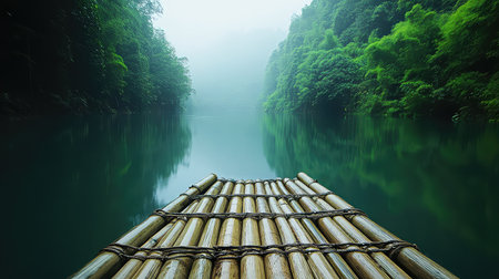 A picturesque bamboo raft rests on a calm river, enveloped in mist and surrounded by vibrant green trees, offering a serene escape into nature.