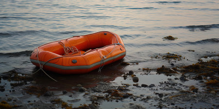 Bright Orange Inflatable Raft Floating on the Open Sea. High quality photo