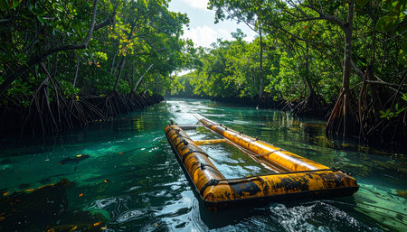 An empty bamboo raft floats gently down a crystal-clear, turquoise river, deep within a lush, untouched jungle.