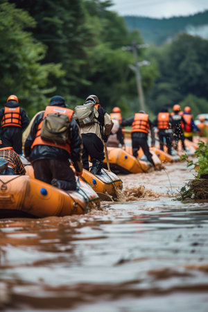 People in life vests pushing rafts, flood rescue operation, intense group effort, urgency.