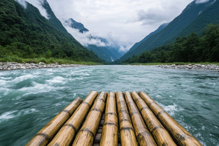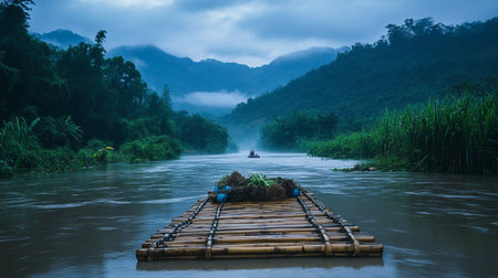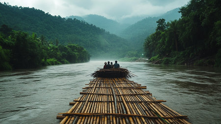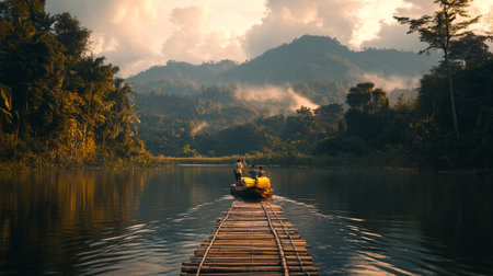 Generative AI : Early Morning at the River Kwai in Thailand with wooden raft travel outdoor touristic concept
