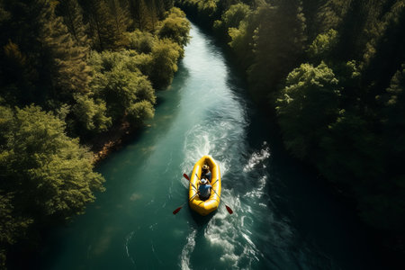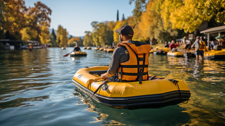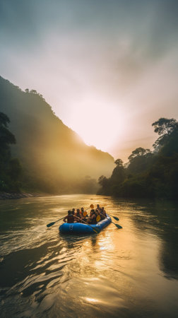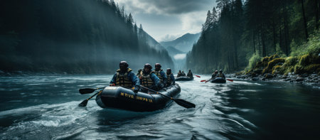 Immerse yourself in the thrilling adventure captured in this photograph. Set against the backdrop of a scenic river, the image depicts a team of courageous individuals engaged in the exhilarating sport of rafting. Generative AI