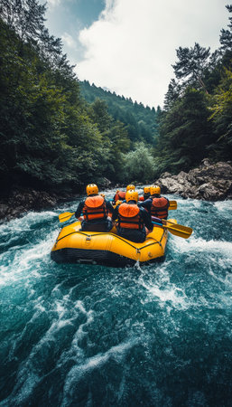 Experience the exhilarating rush of white water rafting as a group of friends navigates turbulent rapids, showcasing a dynamic and adventurous outdoor activity.