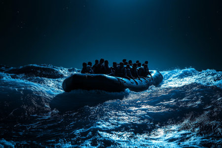 Young people in a small rubber boat drift at night in a stormy sea with dramatic silhouettes