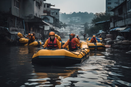 Serious group of people in life jackets and helmet sailing on inflated boat while searching and rescuing residents of town in flooded street during extreme weather conditions in daylight