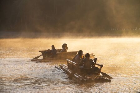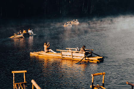 Mae Hong Sorn, Thailand - December 17, 2021 : Beautiful lake over the misty river at sunrise with traveler on the Bamboo raft. Morning view at Pang Oung Lake (Pang Tong reservoir), Mae hong son, Thail