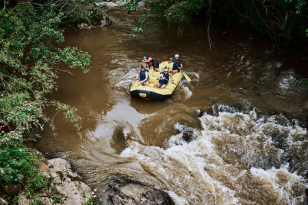 Dynamic action shot of adventurers white water rafting in bright gear amidst thrilling rapids