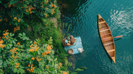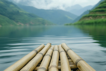 bamboo raft in the middle of a scenic lakeside, created with generative ai