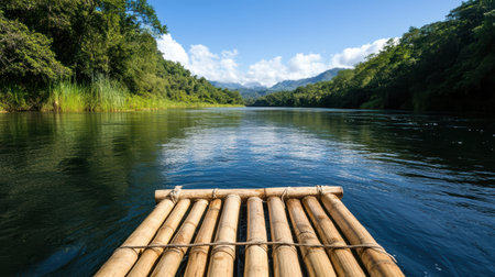 A traditional bamboo raft floats on serene river surrounded by lush greenery