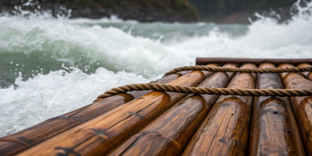 A wooden raft floats on a rushing river as waves crash against its surface. The scene captures the excitement of outdoor adventure on a clear day, surrounded by nature.