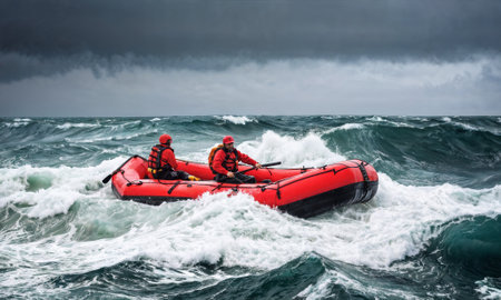 Rescue team in a lifeboat battling rough seas during a storm, depicting bravery and teamwork
