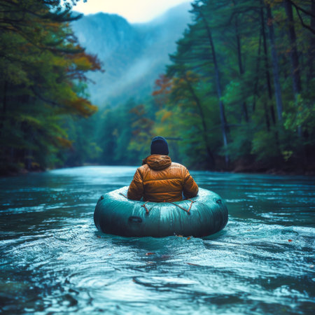 An AI generated illustration of A person donning a jacket joyfully floats on an inner tube in a serene lake