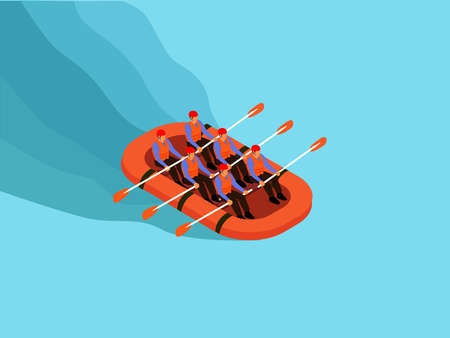 Rafting sports vector concept. Group of people wearing helmet and buoy while rafting on the river